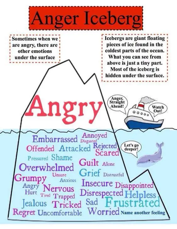 The Anger Iceberg reminds us that when we are feeling angry we are often protecting ourselves from other emotions. Anger is a useful tool as it is full of energy which helps us to act and it keeps others away from us. It can help with our self-awareness to identify which feelings may be below the surface.